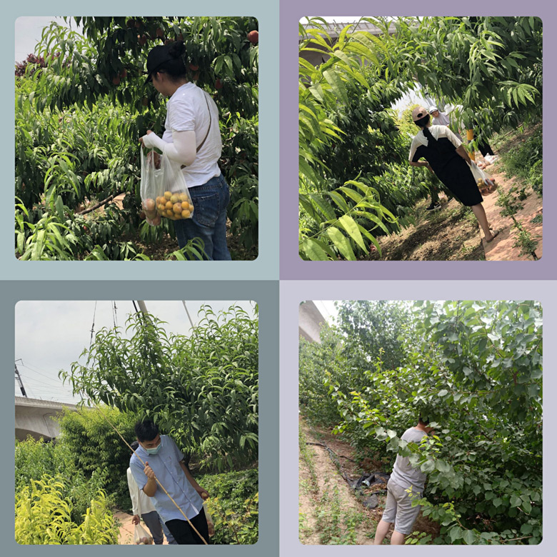 看著枝頭掛滿的桃子,光鮮紅潤,誘人之極,剝開粉青色的外衣,桃汁香甜,果肉滑嫩可口,讓人不禁大快朵頤。今年的桃子似乎長得格外豐茂,枝丫被壓得低垂,似乎有些不堪負重。小伙伴們動起來了,抬手可得,青皮粉頭的毛桃,形狀各異;粉彩誘人的水蜜桃,讓人回味無窮。