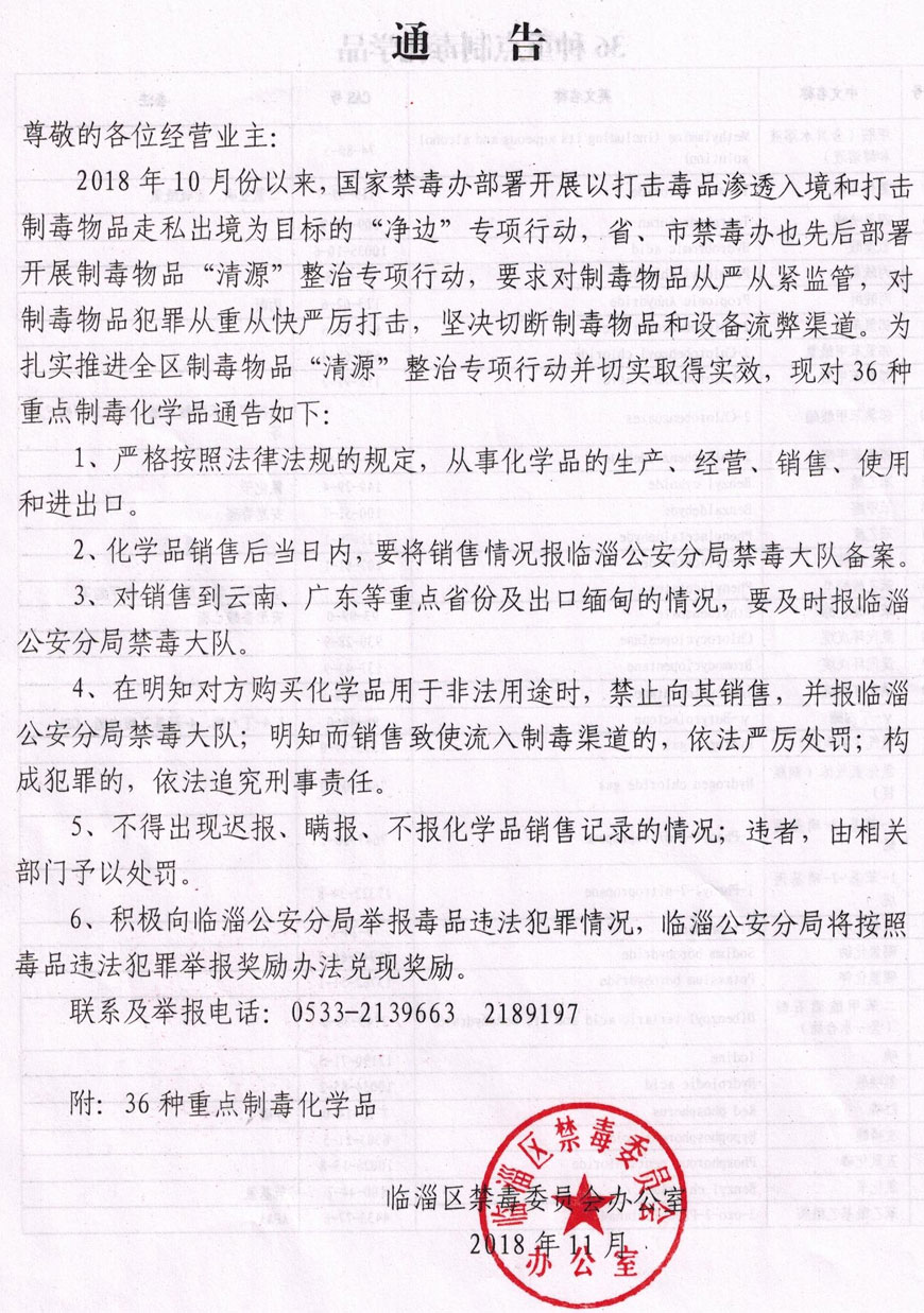 自2018年10月開始,應(yīng)國(guó)家禁毒辦、省、市禁毒辦、臨淄區(qū)禁毒大隊(duì)要求,針對(duì)氯化氫氣體購(gòu)買銷售采取備案制。